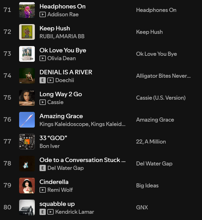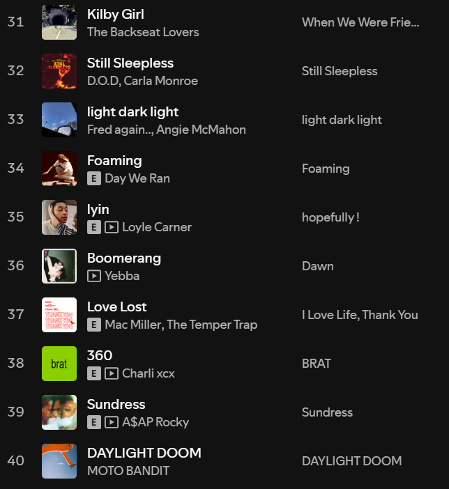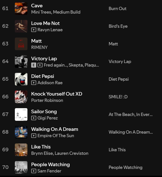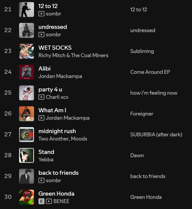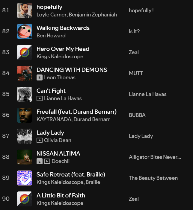 Easily one of my most consistent top artists, and one of my favourite artists of all time. It’s not only the recent release of GMX (my No 1 album last year) that I’ve had on repeat, but Kendrick is without a doubt the top artist I will always consistently dip into old music of ALL the time. There’s just so much depth lyrically, versatility musically and vibes hit thematically across all of his different music. I could write a whole essay about Kendrick’s discography but in short, if you haven’t listed to him, DO IT NOW.